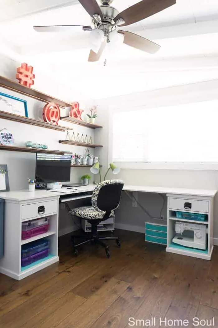 This office makeover below, from Toni at Girl, Just DIY has turned a standard desk into the perfect sewing room, even making space for a sewing machine under the desk.