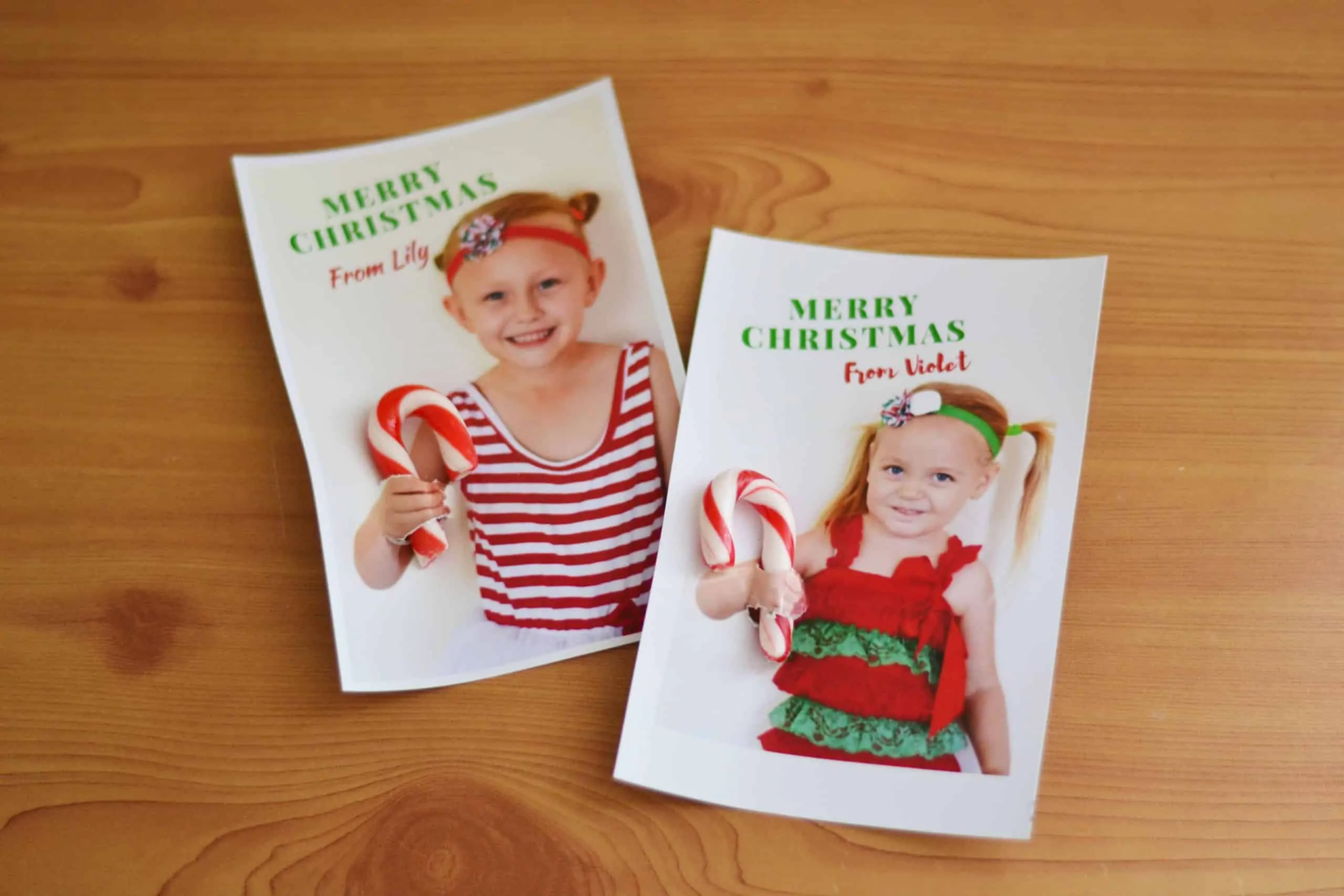 These photo Christmas cards with candy canes are a super easy and fun alternative to a novelty Christmas card. Make them with your kids to give out to their friends.