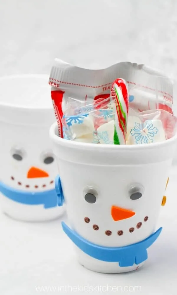 You could actually decorate snowman cups and include anything you like. It does not have to be hot chocolate.