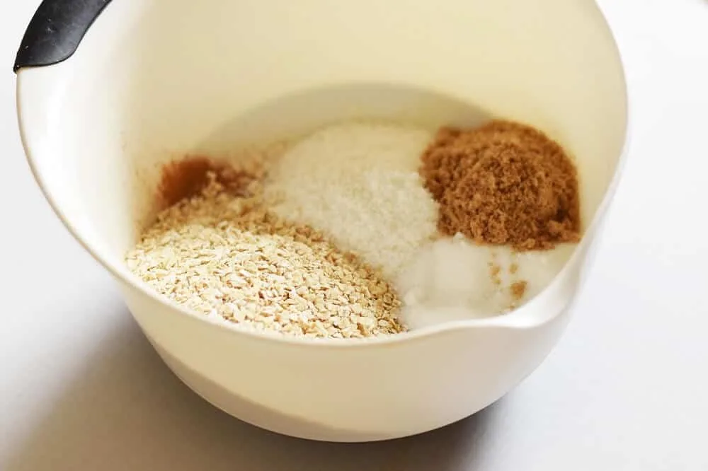 - Sift flour & cinnamon into a bowl. Mix in oats, coconut, and sugars.