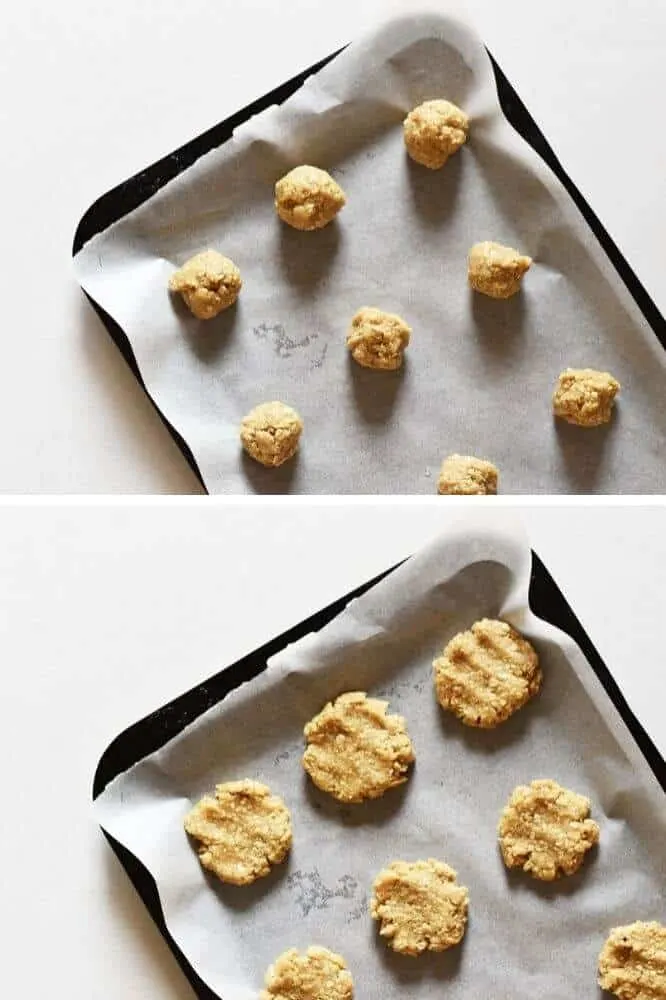 - Roll 1 tablespoon of mixture into balls and place on the tray, leaving approximately 3 cm between them. Press down on cookie dough to make them approximately 1cm thick.