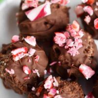 What do you do with leftover candy canes? You make choc peppermint balls! This indulgent Christmas treat is essentially my basic rum ball recipe minus the rolled coconut at the end. Instead, roll them in chocolate and top with crushed candy canes!