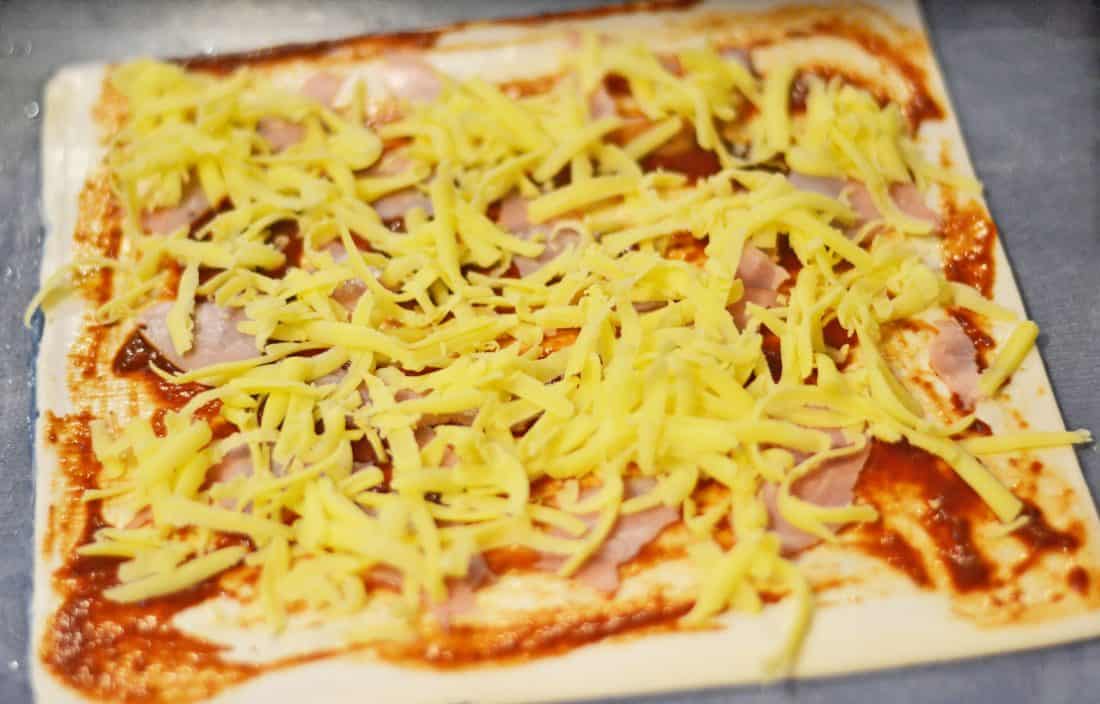STEP TWO – Add your toppings and grated cheese on top. Have your toppings close to the edge on 3 of the 4 sides as this gives you a little room once you roll your pastry.