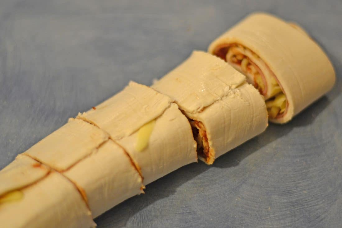 STEP FOUR – Slice the puff pastry pizza roll into smaller portions, approximately 4 or 5 centimetres wide.