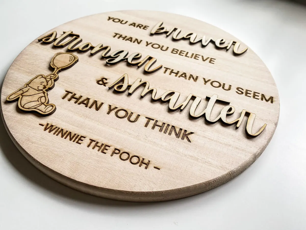 The inspiration for this particular wooden laser engraved sign was for my great niece’s first birthday. The theme was Winnie The Pooh and I just loved the idea of having this quote on display in her room as she grows up.