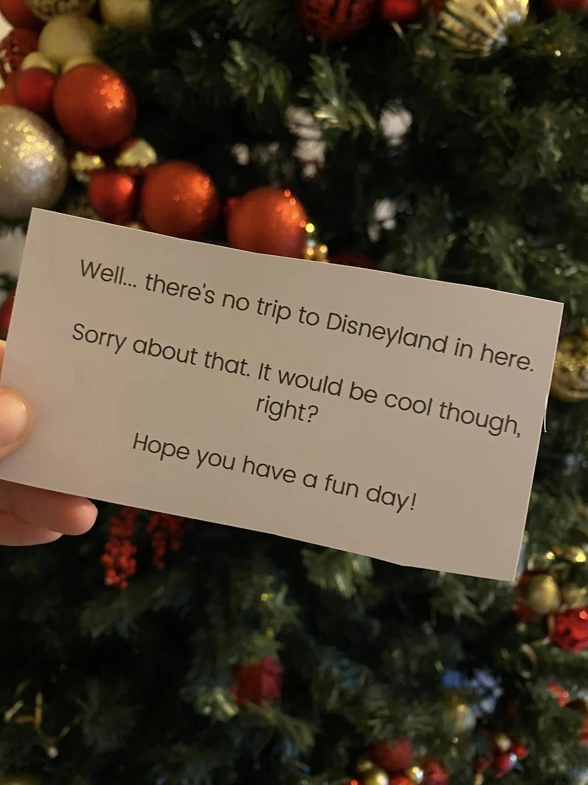 Another year it was a gift with a note that sounded like she was about to get a Disney trip… but just another note inside to say ‘That would have been great.’ We actually did gift them a Disney cruise surprise on Christmas day though!