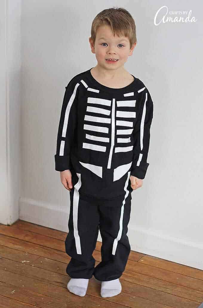 A scary Halloween costume classic – this skeleton costume is an easy and cheap costume idea for kids using duct tape.