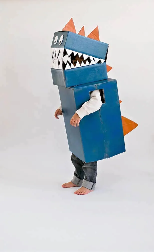 This Dinosaur boxtume could not be any cuter! Turn your little person into a dinosaur with this easy DIY cardboard box costume idea. They can be any colour dinosaur they want!