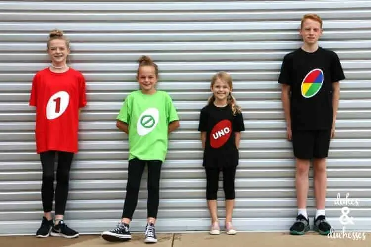 A simple last-minute costume idea for the whole family or for a group of friends, these UNO costumes can be created using a T-shirt and cut out image if you want to keep it really cheap.