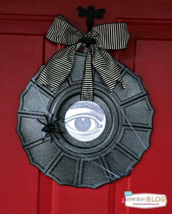 A quick trip to the hardware store for a ceiling medallion and spray paint complete this spooky Halloween wreath.