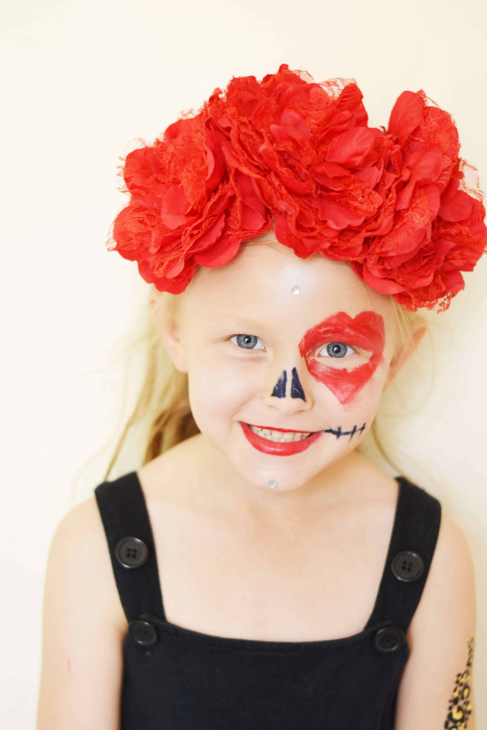 The simple Sugar Skull look has become our go-to last-minute Halloween costume for our girls, who love the chance to have makeup on… even if it is spooky sugar skull make-up!